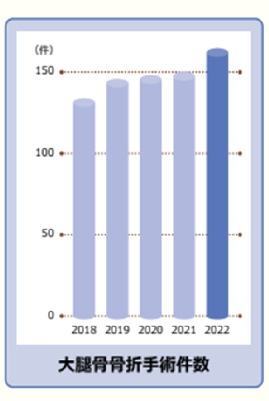 高齢者に多い大腿骨近位部骨折を中心とした骨折に対して早期手術を行い、早期離床およびリハビリテーションの早期開始に取り組んでいます。日を空けずに集中した質の高いリハビリテーションを行うことで、患者さんの身体機能・能力の改善につなげることを目的とし、365日対応のリハビリテーションを実施しています。